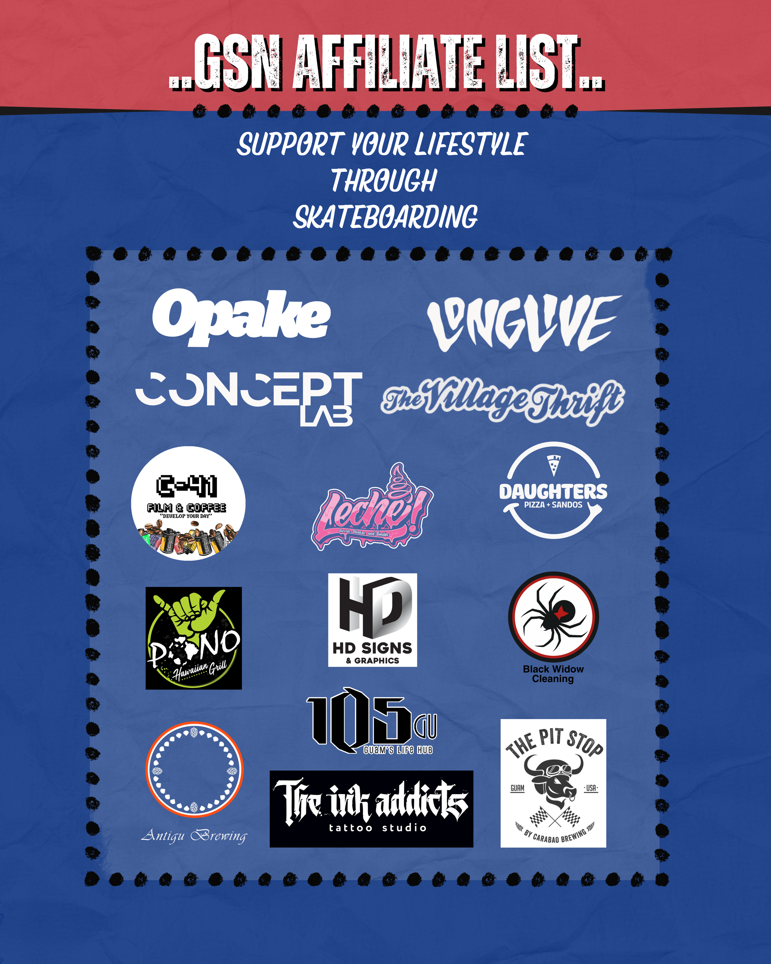 GSN T-shirt ✳︎ GSN Sticker Pack ✳︎ 14 Affiliate Vendors ✳︎ Food Discounts ✳︎ Skateshop Discounts ✳︎ Coffee Shop Discounts
